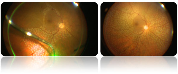 Figure 1. Fundus photography of a patient treated with the diagnosis of proliferative diabetic retinopathy prior to argon laser (left) and following the treatment (right). The pale white dots on the retinal photograph below are laser spots.